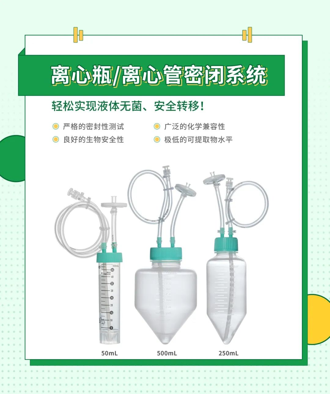 洁特生物离心瓶/离心管密闭系统,,,,,,优选切合USP Class VI标准的质料在GMP标准清洁车间制成,,,,,,具有极低的可提取物水平以及优异的生物清静性,,,,,,可用于全关闭式取样及无菌移液。。。。。产品接纳双层包装,,,,,,每套系统均配备一个自力包装的密封盖,,,,,,可用其替换转移盖,,,,,,便于后续的离心、检测等操作。。。。。