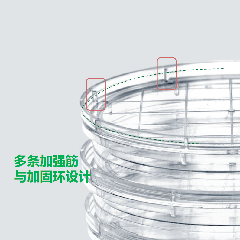 避免侧压变形皿外环多条增强筋与加固环设计,,,,,,,,有用增添皿体强度,,,,,,,,避免侧压变形