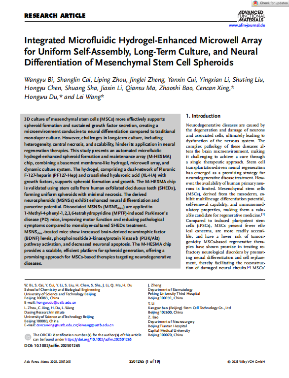2025Äê1Ô£¬£¬£¬£¬£¬£¬£¬±±¾©¿Æ¼¼´óѧ¶ÅºêÎä½ÌÊÚÍŶÓʹÓýàÌØÉúÎï̥ţѪÇåÔÚ¡¶Advanced Functional Materials¡·ÔÓÖ¾¿¯µÇ¸ßÖÊÂÛÎÄ¡¶Integrated Microfluidic Hydrogel-Enhanced Microwell Arrayfor Uniform Self-Assembly, Long-Term Culture, and NeuralDifferentiation of Mesenchymal Stem Cell Spheroids¡·¡£¡£¡£¡£¡£¡£