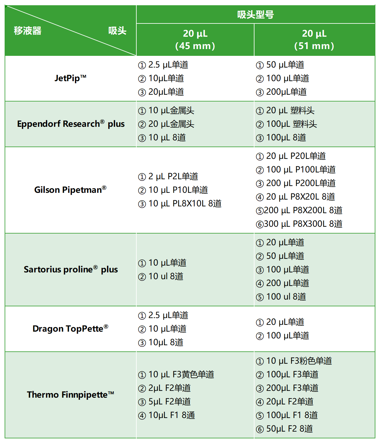20μL吸头适配表