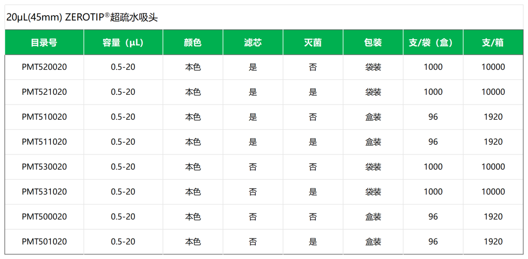 小洁:20μL(45 mm)吸头和20μL(51 mm)吸头一样,,,,,有通俗吸头和ZEROTIP®超疏水吸头两类吗??????